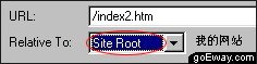 上图中,我们是将文字链接到index2.htm这个文件,特别注意的是最底的Relative To的选项,意思是选择相对路径的形式,默认是Document,也可以选择Site Root,区别在于,Document是指相对路径是从本页开始计算,而Site Root是从根目录开始计算(即“/”),如下图: