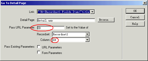 然后我们再选中标题单元格中的{RECORDSET1.title},对它添加一个server behaviors----Go To Detail Page,如图: