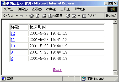 我们的目的就是为了要向detail.asp这个页面传递一个ID值,使其能够正确的取出我们想要的记录。完成了这些后再添加一个More的连接,指向more.asp,以显示更多的新闻纪录。