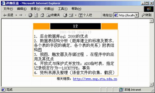 本来,正确的顺序应该是先制作好后台管理页面,做到能够正确的添加、删除、编辑数据的时候才进行前台页面的制作。因为毕竟前台页面做的就只是数据显示而已,如果连数据都不能添加,那你前台做得再漂亮也没用,而且如果在制作后台管理页面可以不用太追求页面美观,一旦出错要重新修改时也快,不像前台,一旦页面设计好了,而要改动时是很辛苦的(尽管Ultradev已经使这项工作变得相对简单了,但还是容易出问题)。不过因为我们这些页面比较简单,数据结构也是简单的,不会出错,所以就不强调这一点了。但是朋友们以后做的时候最好还是按照后台-〉前台这样的顺序来做比较好。