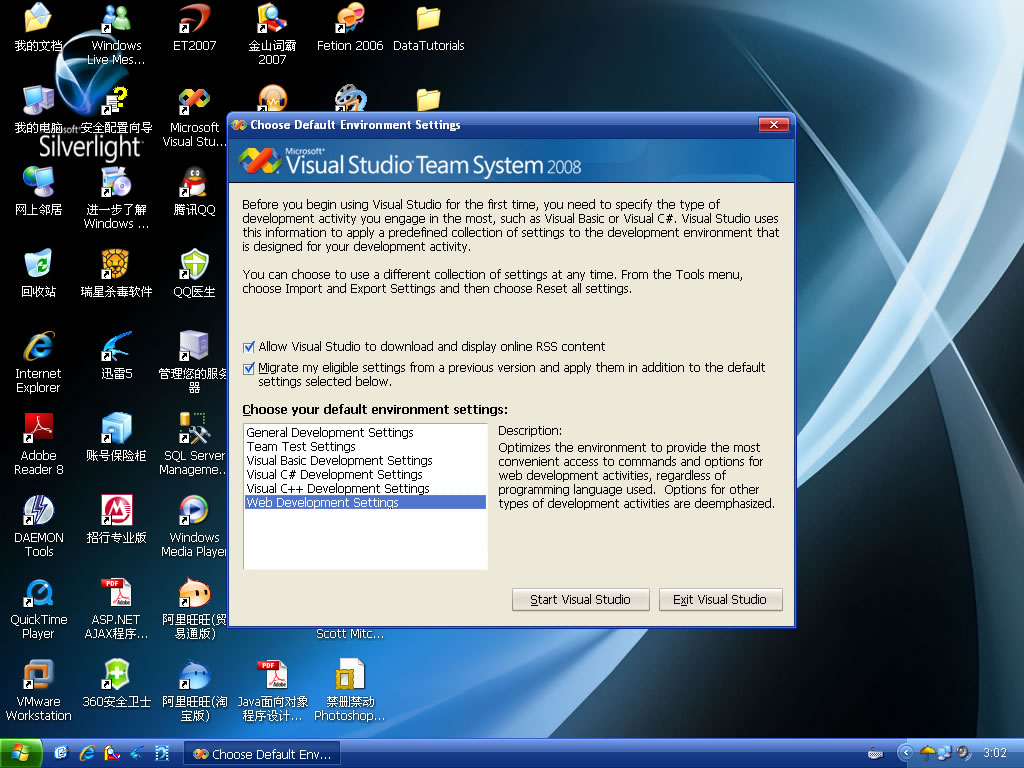 在打开VS2008的时候,它会让你给其设置默认的坏境,你可以根据你的喜好和实际情况选择一个,然后单击Start Visual Studio按钮。