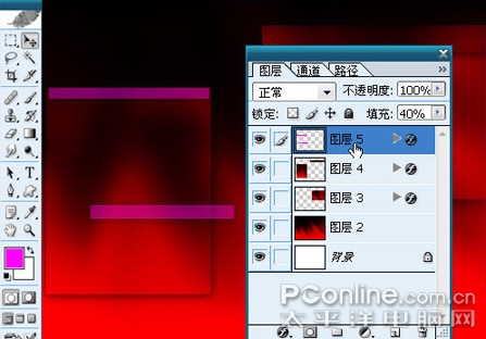 (2)新建一图层,现在先从背景开始,首先设好渐变的颜色(在这小弟用红色和黑色作为背景色,颜色可以根据自己的喜好调定。)在图中按住 shift+鼠标左键向下做直线拉伸。如图2、3所示。+