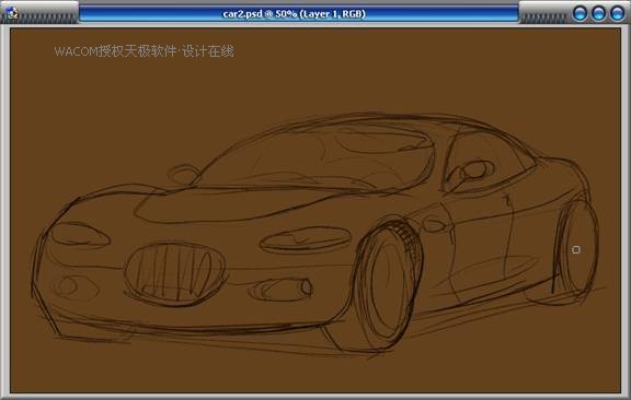 4.新建一层作为上色使用,选用一个30像素左右的标准圆笔刷,进行初步的上色,先确定车身主要的光源关系。