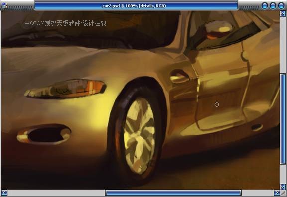6.再建一层作为细化使用,使用一个喷笔模式的软笔刷,柔和局部的层次关系,重点表现金属质感。利用Intuos 3的轻柔运笔手势,控制喷笔工具的作用强度。