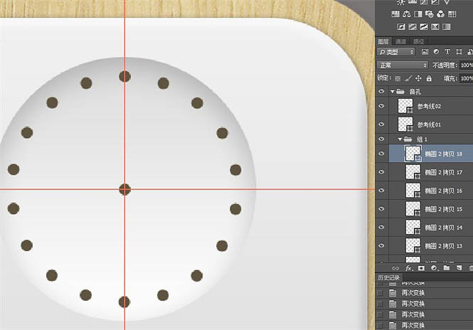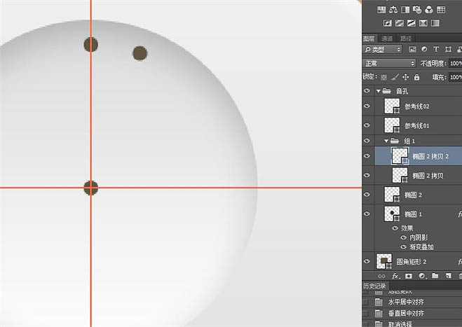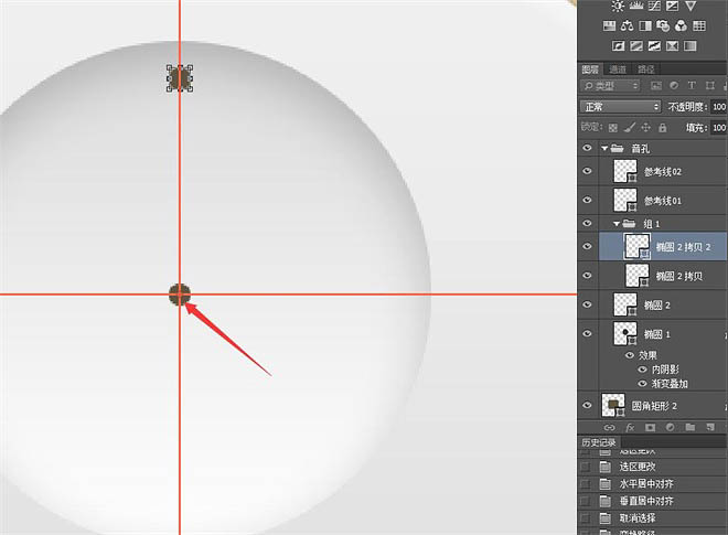 新建一个直径为11px的椭圆,与“椭圆 1”水平、垂直居中,填充颜色#5f543f。然后用矩形工具手动画两根参考线,找到圆心,效果图如下。
