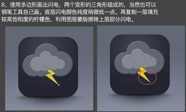 8、使用多边形画出闪电,两个变形的三角形组成的,当然也可以钢笔工具自己画。底层闪电颜色纯度稍微低一点。再复制一层填充较高饱和度的柠檬色,利用图层蒙版擦除上层部分闪电。