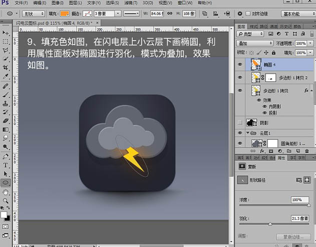 9、填充色如图,在闪电层上小云层下画椭圆,利用属性面板对椭圆进行羽化,模式为叠加,效果如图。